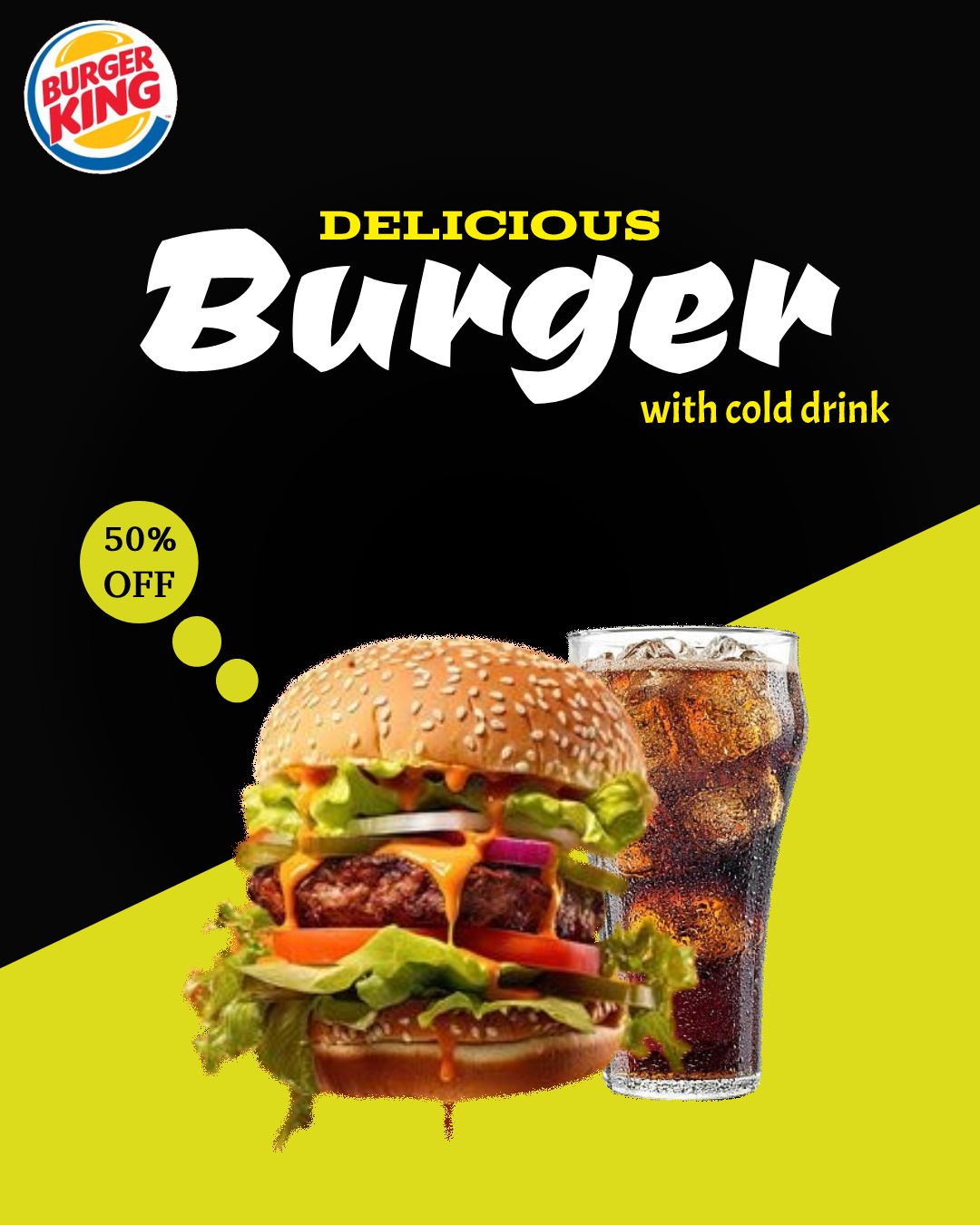 A mouth-watering burger with a juicy patty, fresh lettuce, melted cheese, and crispy buns. The background is vibrant, making the burger stand out. Bold, eye-catching text highlights “Hot & Tasty Burger” with a tagline like “Savor the Flavor!” A simple and clean design perfect for a food menu or advertisement.