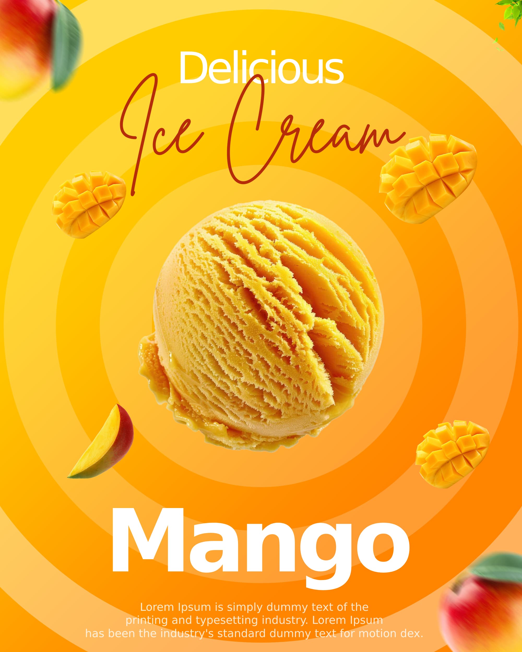 This ice cream poster is bright, colorful, and fun! It features a delicious scoop of ice cream in a cone with fresh toppings. The background has soft pastel colors, giving it a sweet and happy feel. The text is bold and playful, making it easy to read. This design is perfect for an ice cream shop, summer festival, or dessert promotion. The layout is clean and eye-catching, making the ice cream look even more tempting!